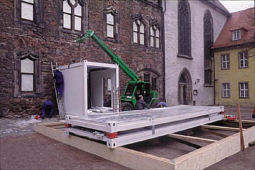 Seit Anfang dieses Jahrhunderts dient die Moritzburg als Museum und Gemäldegalerie. Oft leiden ausgestellte Werke jedoch empfindlich unter der historischen Architektur, die den Anforderungen einer Kunstsammlung nicht immer genügen kann. Mit einigen baulichen Provisorien im Ausstellungsraum, der vormals fürstbischöfliches Gemach und später Turnhalle war, befaßt sich eine Lichtinstallation von Johanna Bartl. Ein neuerliches Provisorium, nämlich ein anläßlich dieser Ausstellung im Innenhof aufgebauter Container, verweist auf jenen klassischen Typ von Museumsraum, der in der Moritzburg fehlt: den White Cube.