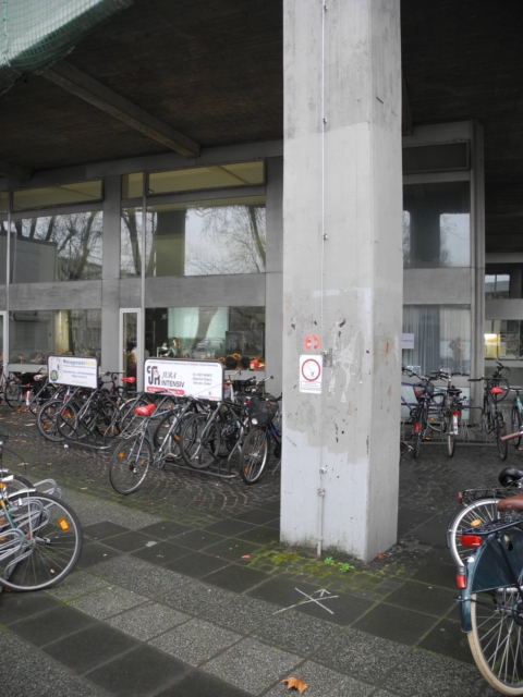 Hier hat die Uni um die Bäume ein Metallgestell angebracht, damit die Studenten ihre Fahrräder daran anschließen können und der Baum unbeschädigt bleibt. |